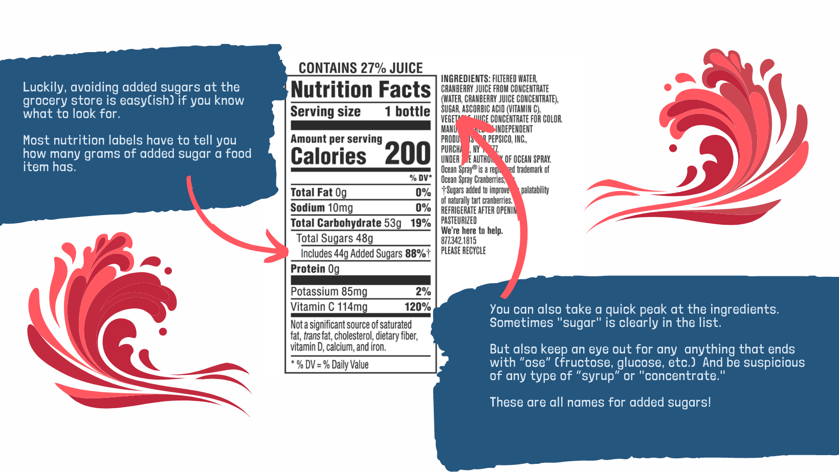But the real concerns about added sugar run a lot deeper than calories. The problems have to do with what added sugar does to your blood glucose levels. When you consume added sugars, all those sugars enter your bloodstream superfast. Think about the difference between a bottle of ocean spray cranberry juice and eating an equivalent amount of sugar worth of cranberries. One, you probably would give up before you ate all those cranberries. But more importantly, it would take a long time to eat them, digest them, and then absorb the sugars. All that extra time holds the key to avoiding a blood glucose spike. That bottle of ocean spray is hitting your belly and your bloodstream like a tidal wave. Your body needs to maintain glucose levels in a very strict range. When blood glucose gets too high, it can damage blood vessels throughout your body and can cause long-lasting effects to your entire immune system triggering chronic inflammation. Basically high blood glucose is no bueno.